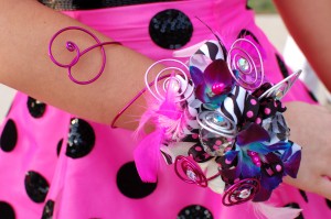 This fashion forward teen is all about wire in her prom corsage! Polka-dots, orchids and swirls abound! There are a ton of frills and swirls in this corsage, and the reason it works SO well is because the florist knew to compact them down to a workable size. Kudos Adams Florist, Paragould AR. Check out this post about Matching Corsage To Prom Dress