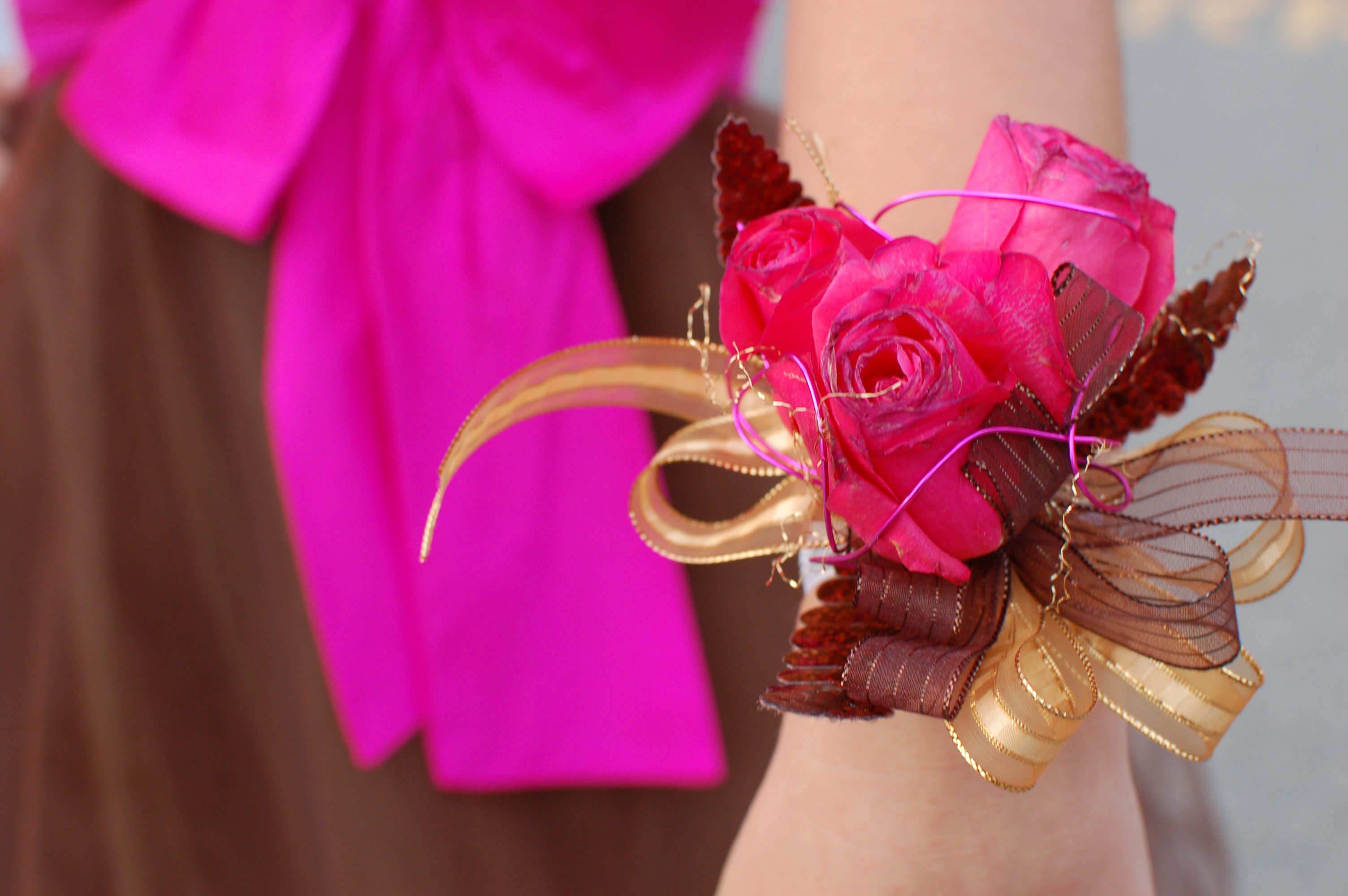Perfect Match to the perfect dress! This pink rose with brown and gold ribbon make a perfect accent to this girls dress of the same colors. Check out this post about Matching Corsage To Prom Dress