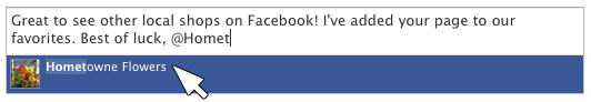 - Online Friends – ‘Like’ other area businesses on Facebook and add them to your favorite pages. (Just under their business’s profile image, click “Add To My Pages Favorites”) Once you’ve done this, go to their wall and leave a friendly, little message, “Great to see other local shops on Facebook! I added your page to our favorites. Best of luck, @Hometown Flowers“ The “@” is very important.