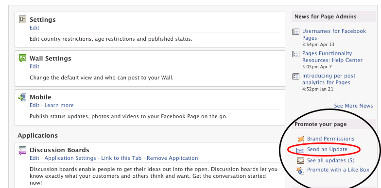 Step 2. This page is where you edit the settings of your business page. On the right side menu, there is a small box called “Promote Your Page.” Here you will want to click “Send an Update.“