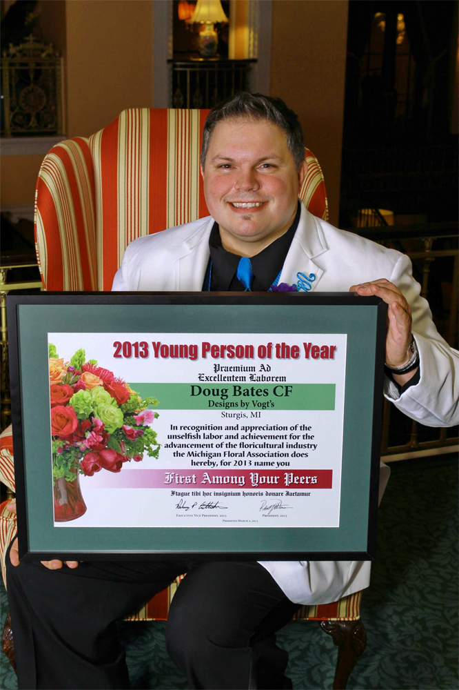 - Congratulations to Doug Bates of Designs by Vogt’s in Sturgis MI for being voted the 2013 Young Person of the Year at the Great Lakes Florist Expo.