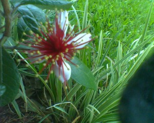 Pink and white bloom of a Feijoa sellowiana (Pineapple Guava). Produces an edible fruit and is hardy in zones 8 and above.