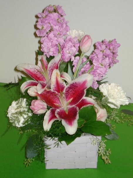 Traditional flower arrangement in a white square basket designed by Every Blooming Thing in Akron Ohio. Features stargazer lilies, carnations and other beautiful flowers.