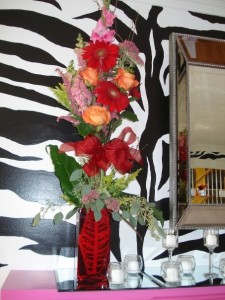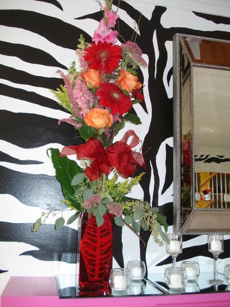 Contemporary flowers arrangement in front of a zebra striped wall designed by Every Blooming Thing in Akron Ohio.