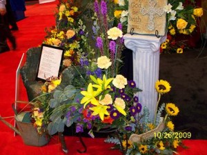 Photo of an assortment of funeral flower arrangements displayed with pedestal with sympathy plaque and poem.