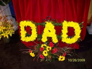 This photo shows a personalized funeral flower arrangement using one of Smithers Oasis floral foam shapes in the letters DAD.