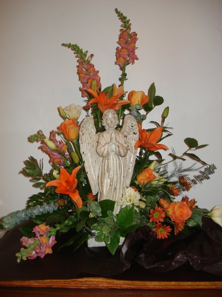 This photo depicts an angelic sympathy arrangement designed by Every Blooming Thing, an Akron Ohio flower shop.