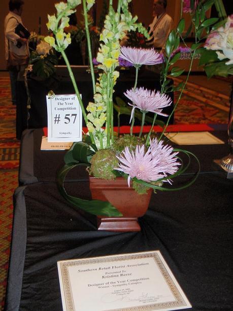 These sympathy flowers won first place in the design competition. Congratulations to Kristina Reece of Floral Dimensions, a flower shop in Durham, North Carolina.