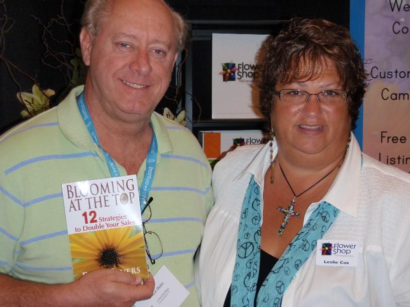 This photo shows Leslie Cox of Flower Shop Network with Rick Rivers of A Floral Boutique, a flower shop in Ormond Beach Florida.